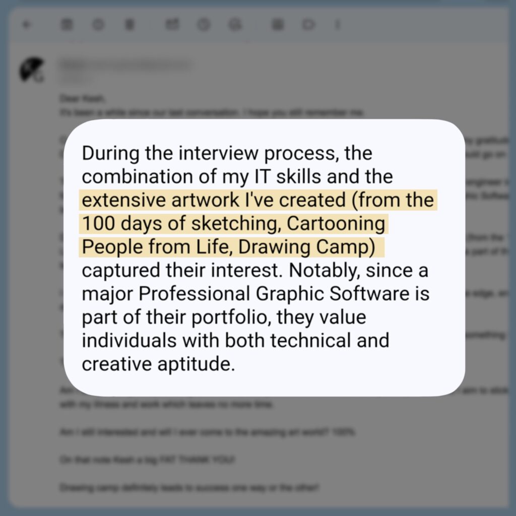 Here’s Kevin, a student of drawing camp on how he has leveraged the drawing skills he has learned from Drawing Camp to get a high paying job in an Art based software engineering position. 👇