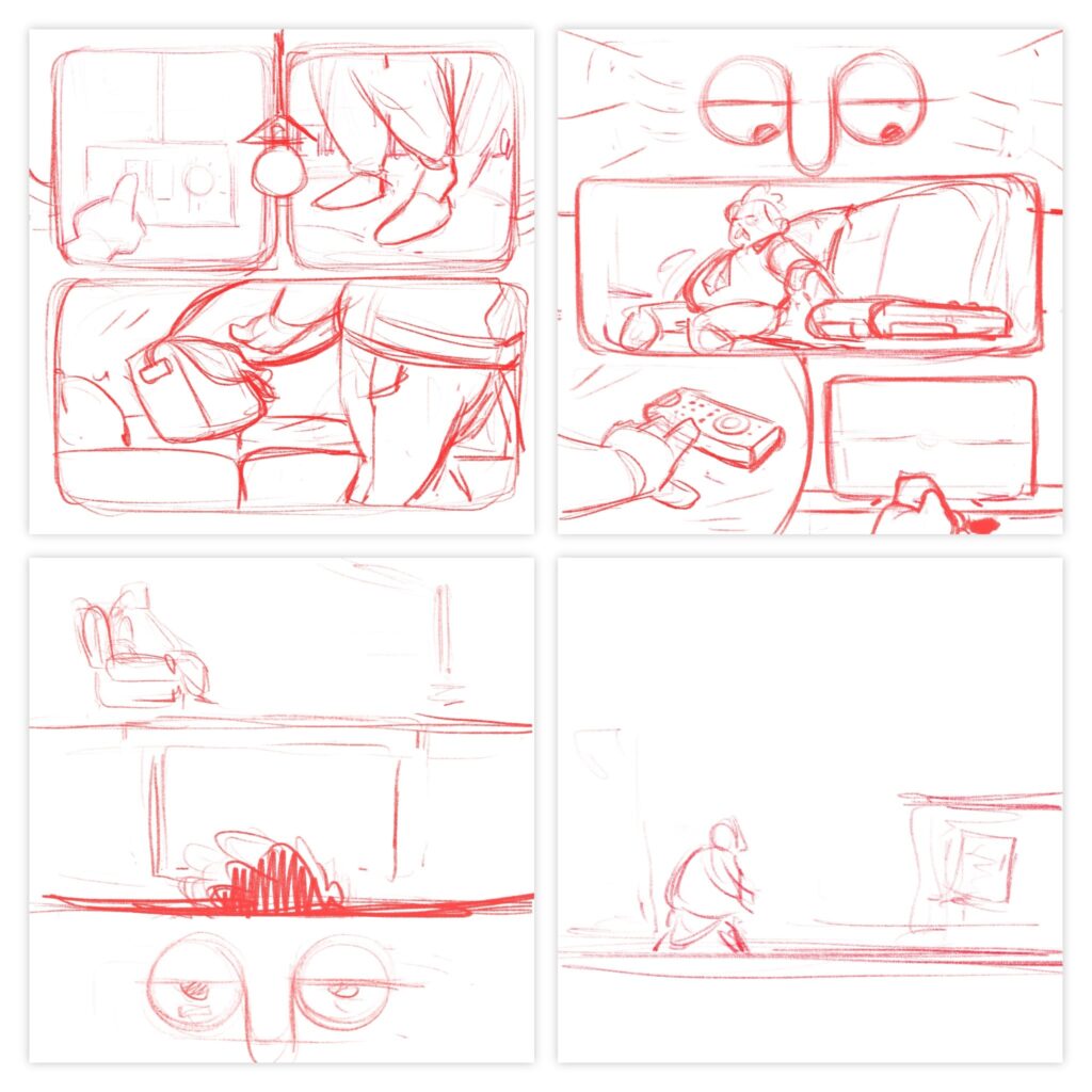 Thumbnailing is when I quickly sketch the rough layout of my comic. This is the stage where I block out the basic shapes, panel layout, along with composition of the pages.